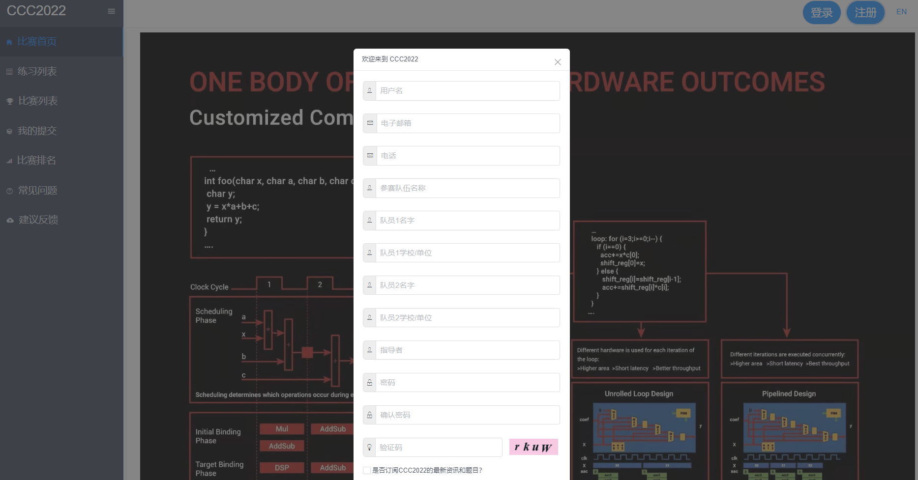 - 打开首页,点击右上角“注册”,填写必填项:“用户名”、“电子邮箱”、“电话”、参赛队伍名称、“队员1名字”、“队员1学校/单位”、“密码”,非必填项:“队员2名字”、“队员2学校/单位”、“指导者”,并选择是否订阅CCC2022的最新资讯和题目,完成账户注册。点击“登录”,输入用户名、密码,完成登录。