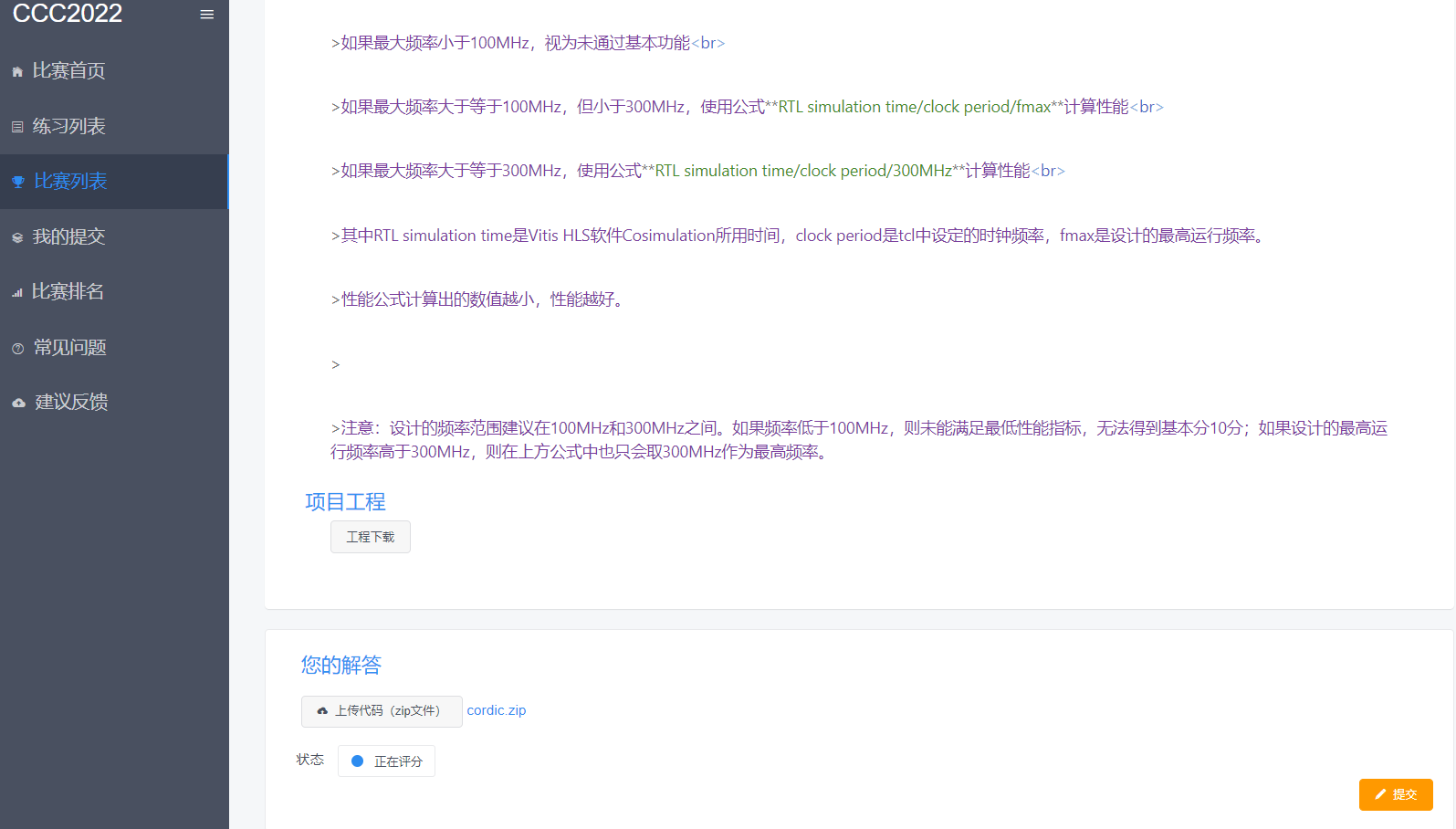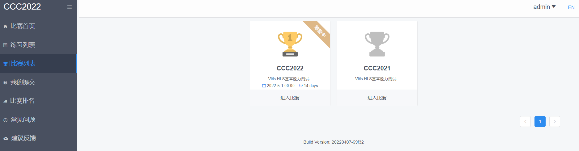 打开CCC2022首页,可通过点击页面的Tab(比赛首页、练习列表、比赛列表、我的提交、比赛排名、常见问题、建议反馈)切换页面。