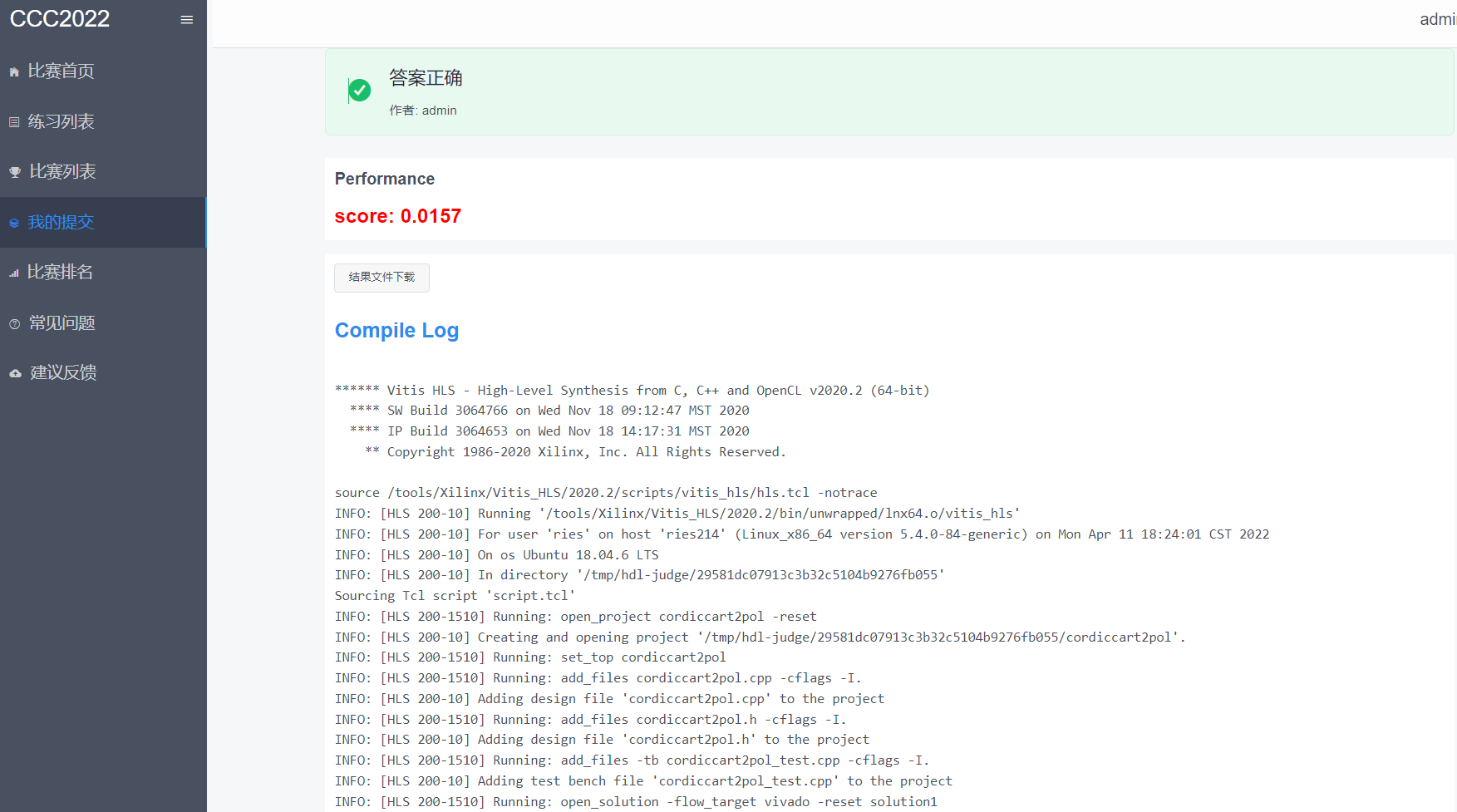 - 可点击提交状态进入提交详情页面查看编译日志和结果文件